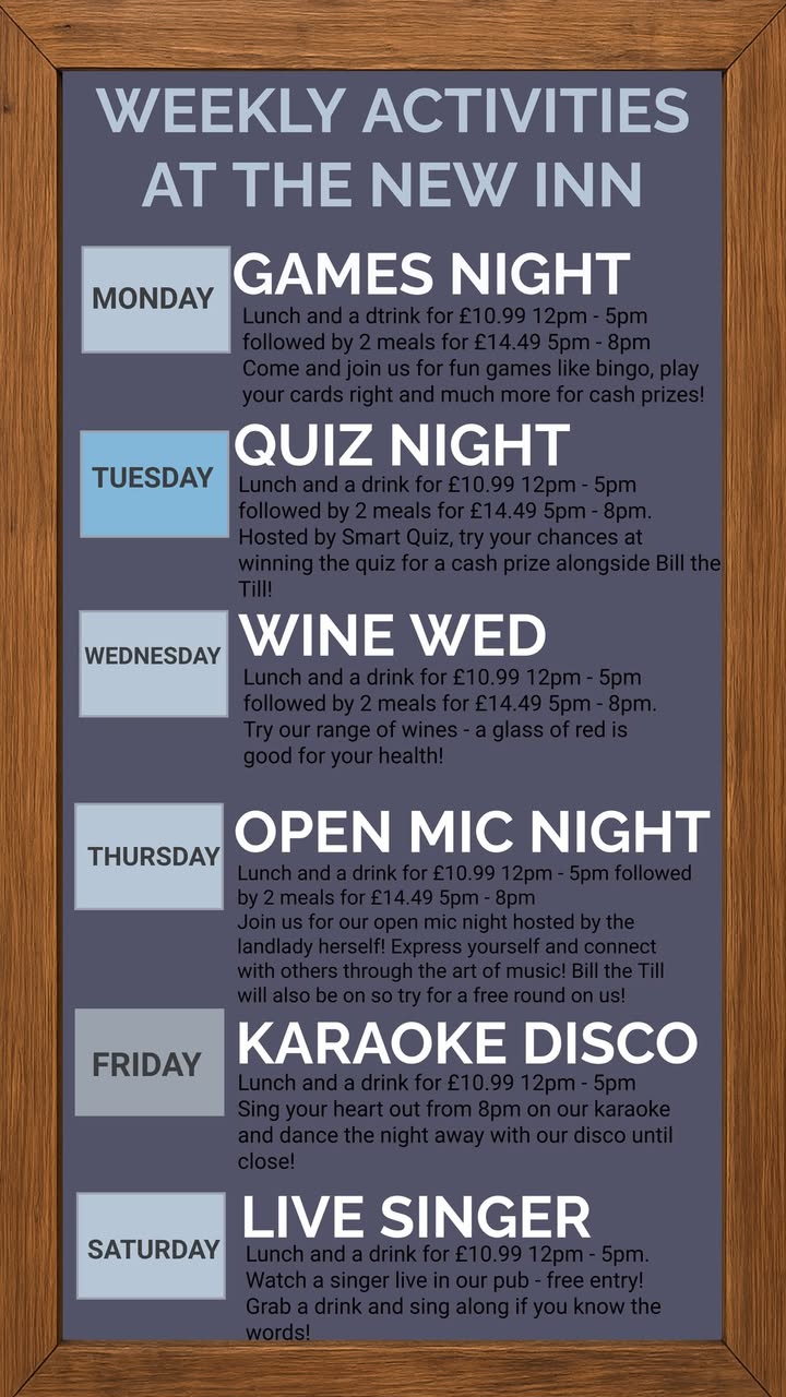 Whether you’re here for a meal, drinks with friends, or to watch live sports, The New Inn is the perfect spot for every occasion.